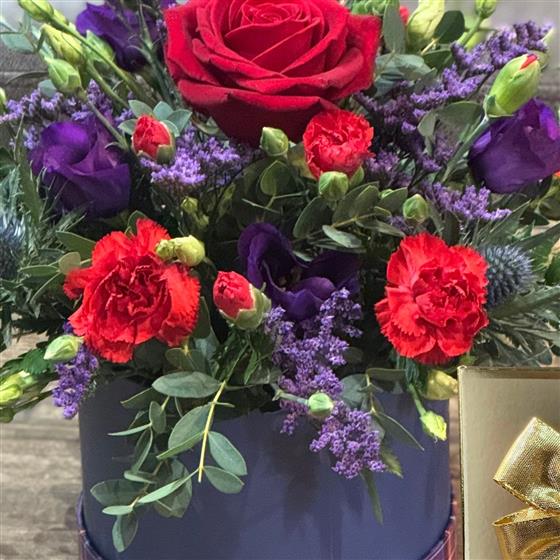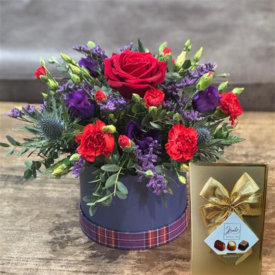 A petite hatbox design, inspired by our very own Ayrshire Casanova, Robert Burns. Ae Fond Kiss showcases a stunning red rose in the centre with some Eryngium Thistles and red carnations with other fillers and foliage's.