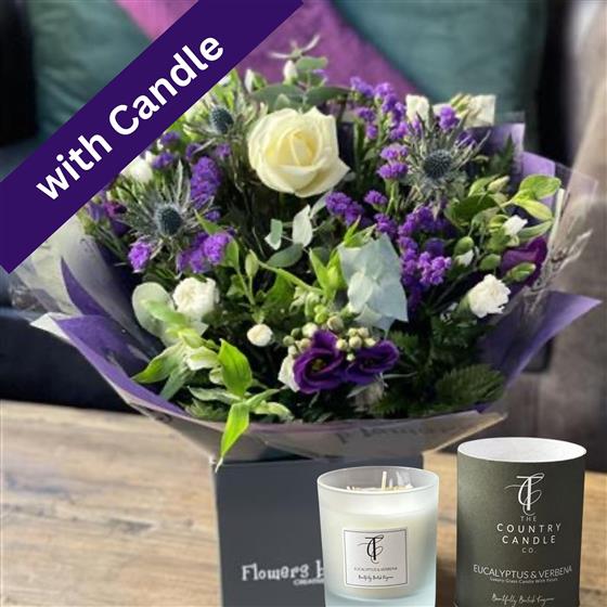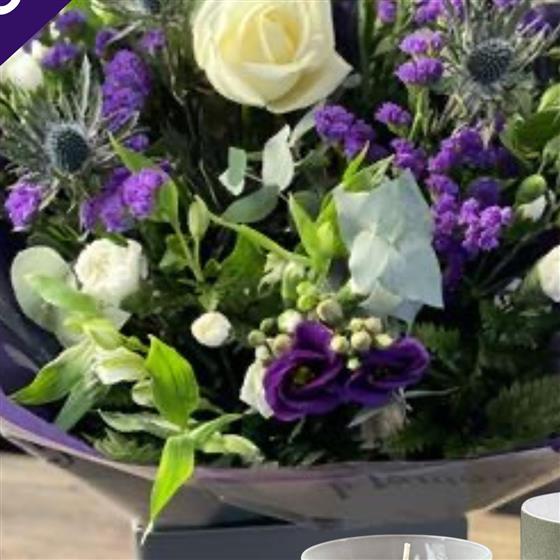 Celebrate Scottish pride with this stunning, patriotic hand-tied bouquet. The Scottish design features a beautiful blend of White Roses, Eryngium Thistles, Purple Eustoma, White Standard and Spray Carnations, Purple Statice, and White Alstromeria, complemented by seasonal foliages. Expertly arranged by our florists, and wrapped in grey and purple tissue and cellophane, it arrives in our presentation box. This impressive bouquet makes a truly memorable gift.