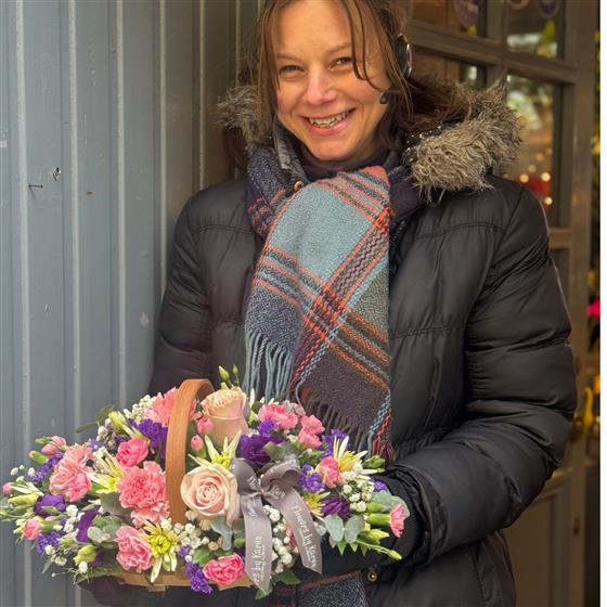 A beautiful pastel mix of delicate pink, cream and purple tones , perfect for conveying sentiments of love, appreciation, or simply brightening someone's day. Arranged in a lovely trug basket by our expert florists