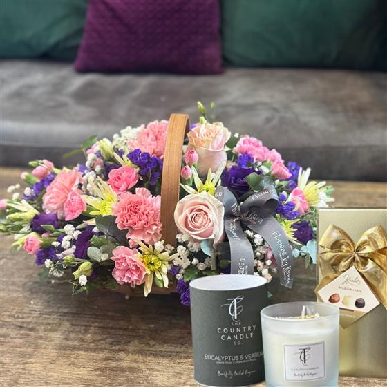 COUNTRY MEADOW TRUG WITH CANDLE AND CHOCLATES