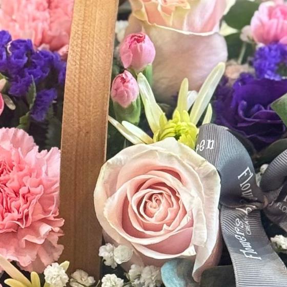 A beautiful pastel mix of delicate pink, cream and purple tones , perfect for conveying sentiments of love, appreciation, or simply brightening someone's day. Arranged in a lovely trug basket by our expert florists