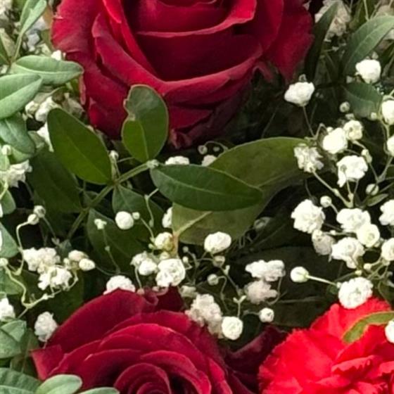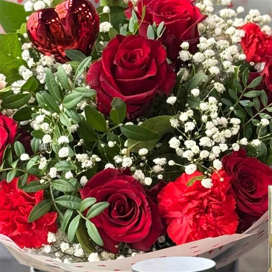 6 Long Stemmed Red Roses and 6 Red Standard Carnations hand tied with seasonal foliage and a sprinkling off Gypsophila. Our florists will wrap in our premium packaging complete with water bubble.