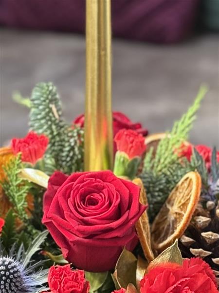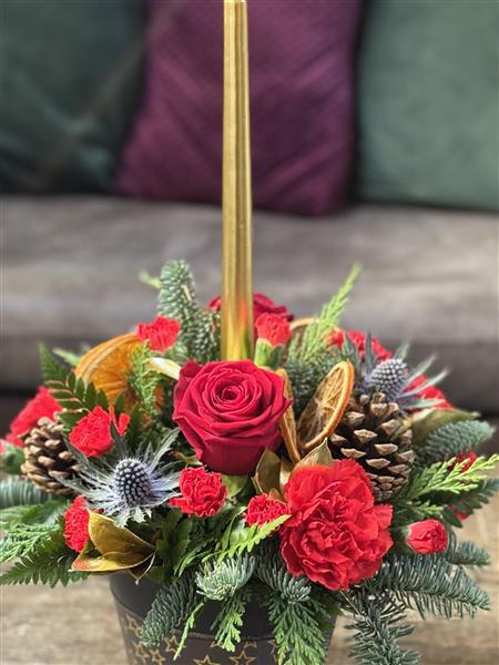 Festive Flicker table arrangement, lovely rich reds with some gold foliage and Thistles, designed in a pretty midnight blue zinc pot with gold star motif