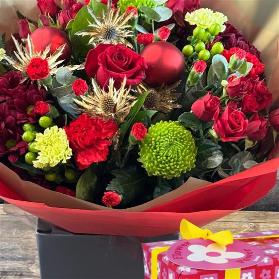 Prepare to dazzle them with this show-stopping, hand-tied bouquet! A truly rich mix of deep reds and lush greens creates the quintessential traditional Christmas display. Expertly arranged and beautifully presented in high-quality gold and vibrant red cellophane, this bouquet is more than a gift—it's a luxurious statement of festive cheer. Perfect for sending a heartfelt, classic Christmas sentiment this season.