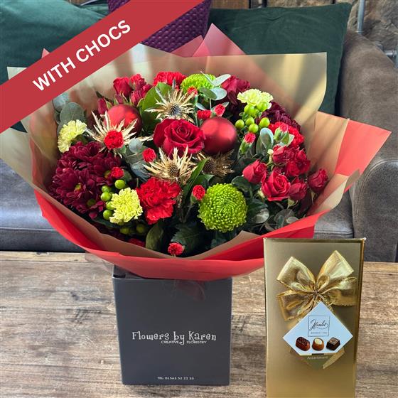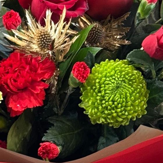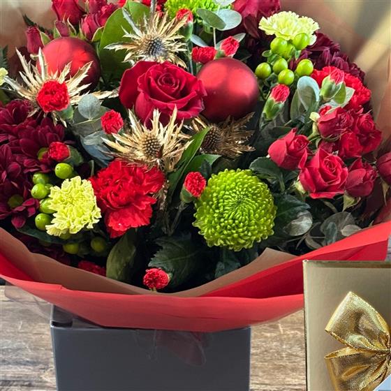 Prepare to dazzle them with this show-stopping, hand-tied bouquet! A truly rich mix of deep reds and lush greens creates the quintessential traditional Christmas display. Expertly arranged and beautifully presented in high-quality gold and vibrant red cellophane, this bouquet is more than a gift—it's a luxurious statement of festive cheer. Perfect for sending a heartfelt, classic Christmas sentiment this season.