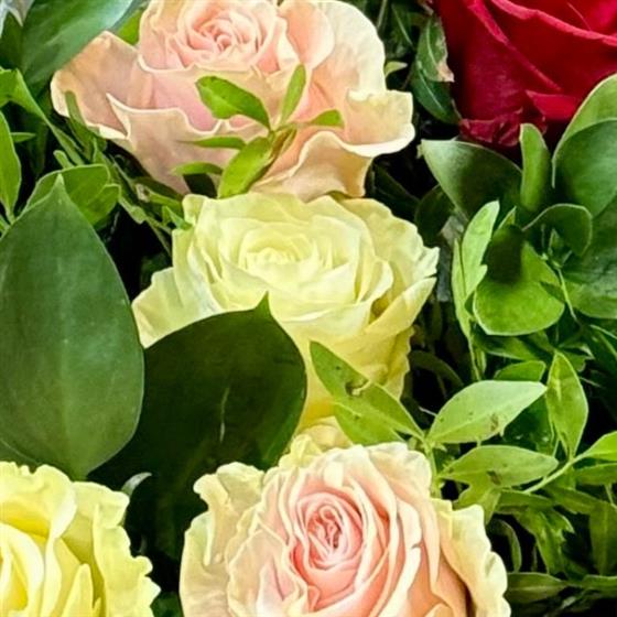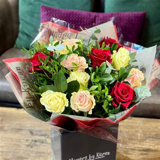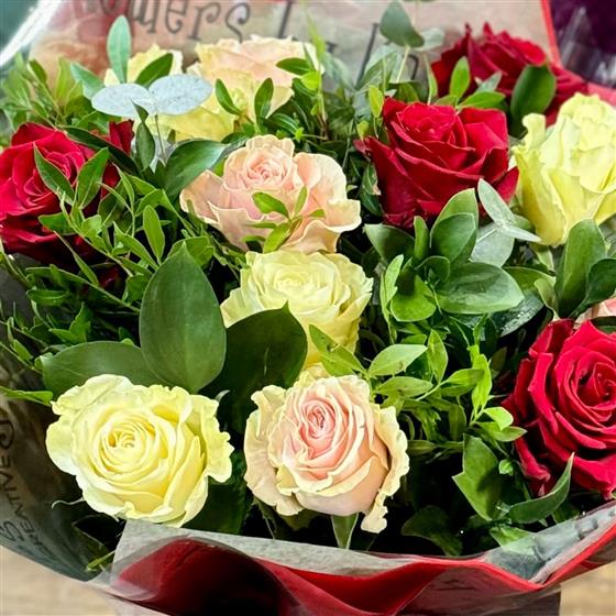 12 Mixed Roses, we have chosen stunning Red Naomi alongside Pink and White Mondial, With seasonal foliages to create this beautiful gift. Expertly hand tied and wrapped in our premium packaging