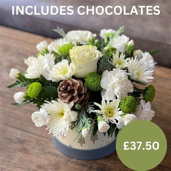 This petite hatbox design is a perfect gift for the season. Crisp Greens and Creams to compliment the winter pine hatbox