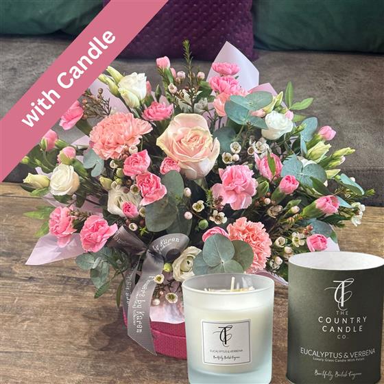 A beautiful all round design in a pretty hatbox. Lovely soft pink tones, guaranteed to delight any recipient. Hassle free gift with no need for a vase, as design is arranged in floral foam for easy display