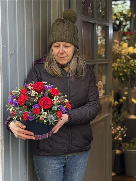 Inspired by Ayrshire’s greatest bard. This stunning all-round arrangement is housed in a midnight blue hatbox, with a traditional tartan lid. A true nod to our Scottish roots. At its heart, two premium red roses take pride of place, surrounded by a lush selection of red and purple blooms. We have of course included Eryngium Thistles too.