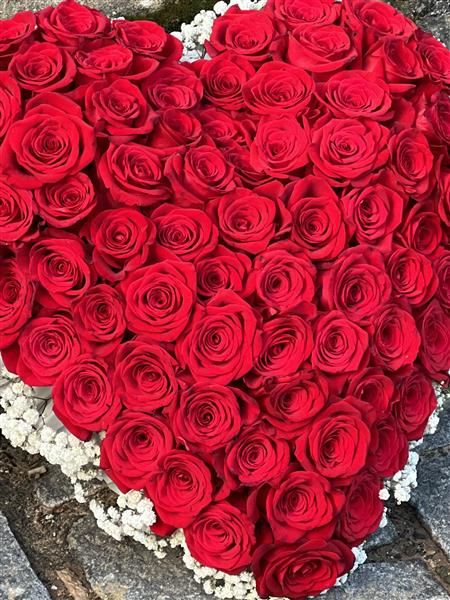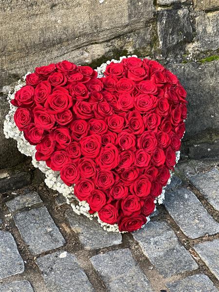Simply stunning. All Red Rose Heart tribute with a soft crown of gypsophila. This tribute is created on a 17 inch base.