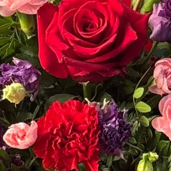 Stunning hatbox design with pretty pink and romantic reds. Single red rose nestled in the centre with red and pink carnations and purple Eustoma.