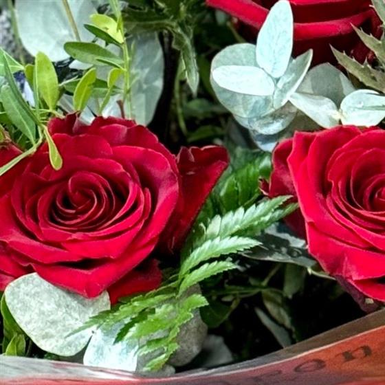 Express your love this Valentine's Day with a touch of unique elegance. This hand-tied bouquet showcases 12 premium Explorer roses, their velvety petals perfectly complemented by the distinctive texture of Eryngium thistles. Expertly arranged with seasonal foliages and presented in stylish red and grey tissue and cellophane, this stunning gift arrives in our signature Flowers by Karen gift box, ready to delight.