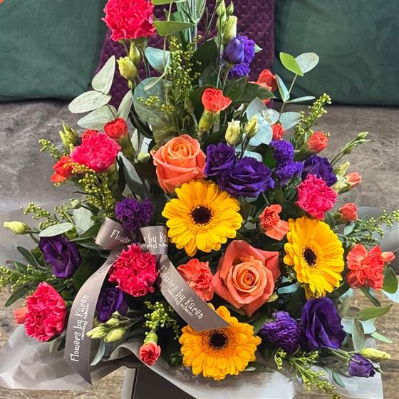 A striking Front Facing Arrangement is beautiful bright tones. Bursting with colour this display is sure to brighten anyone's day .
