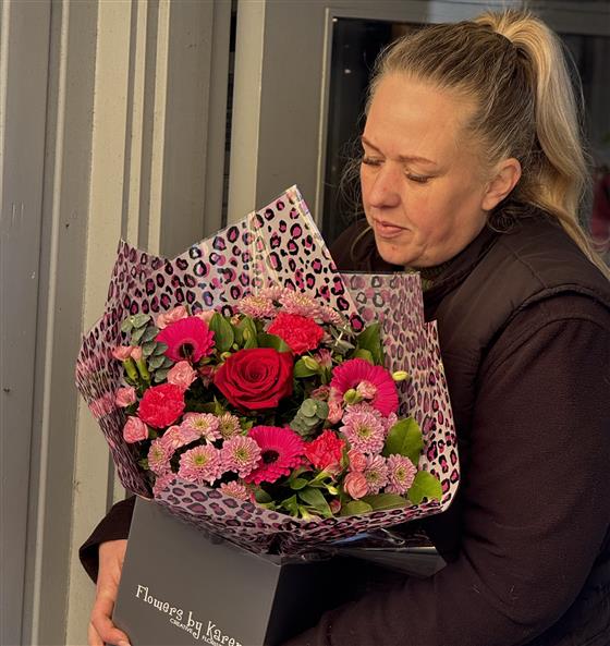 Surrounded by a lush mix of passionate reds and pink blooms, the bouquet is finished in a pink leopard print cellophane. It’s the perfect blend of timeless elegance and modern flair—because a love this deep deserves to be celebrated with a little roar. ❤️