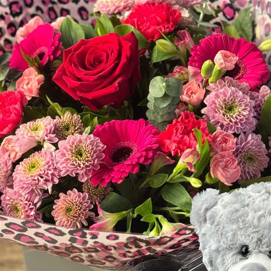 Surrounded by a lush mix of passionate reds and pink blooms, the bouquet is finished in a pink leopard print cellophane. It’s the perfect blend of timeless elegance and modern flair—because a love this deep deserves to be celebrated with a little roar. ❤️