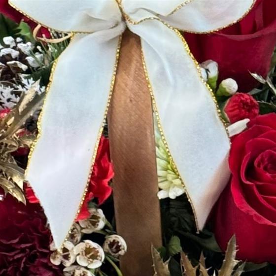 Celebrate the season with this beautiful festive basket, designed perfectly in keeping with treasured Christmas traditions. Our expert florists have created a rich display featuring romantic red roses and deep burgundy carnations, accented with a light sprinkling of creamy Delianne chrysanthemums. Arranged in hydrating floral foam for extended freshness and finished with an elegant white velvet bow, this arrangement is a beautiful, easy-to-care-for gift that captures the warm spirit of the holidays.